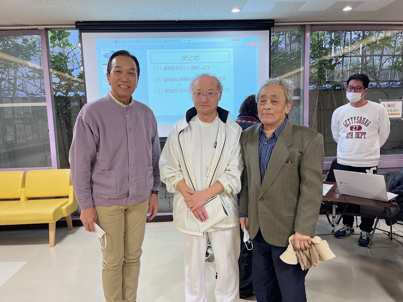 実は、私の中学時代の友人M君がわざわざ来てくれました。M君とは昨年11月の「健康まつり」で50年以上ぶりに再会したのでした。講座のあと、私の通院患者さんであるKさん、M君と私で、いろいろと雑談をしました。