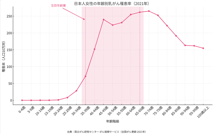 乳がんは40〜50代で多く、60〜70代でも発症のピークが続きます。近年は30代後半の発症も増えています。