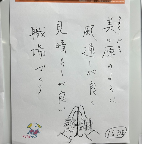 コロナ禍以降、コミュニケーションが低下し、どうすればよい職場になるのか、今回はハラスメントの側面からそれぞれのグループで考え、私のグループでは標語として、「美ヶ原高原のように、風通しがよく、見晴らしがよい、職場づくり」となりました。