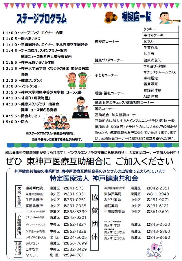 東神戸病院をはじめ、地域の診療所・介護・福祉事業所などが協力し、体験やステージ、模擬店など盛りだくさんのイベントをご用意しています。