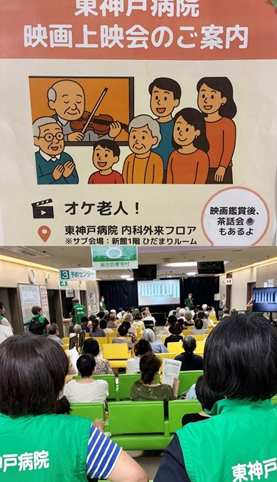 地域の方々に向けた「映画上映会」が開催され、運営スタッフとして参加してきました。たくさんの方に参加してもらおうと送迎車も用意、当日は100人を超える方に来ていただき、外来フロアだけでなく、第2会場もいっぱいに。