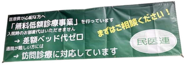 新しい横断幕は、「無料低額診療事業」「差額ベッド代ゼロ」「訪問診療に対応しています」の3点を知らせたものです。